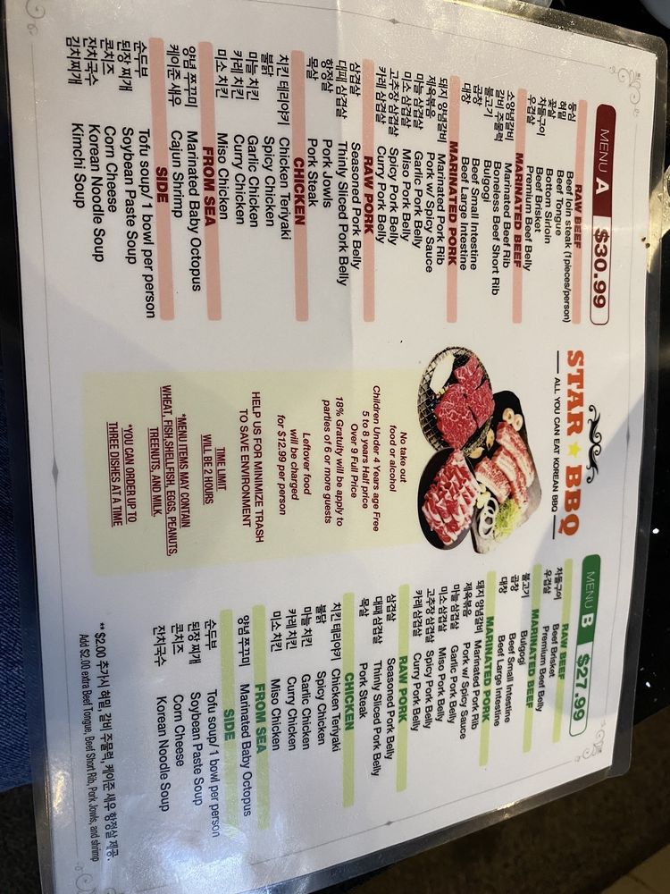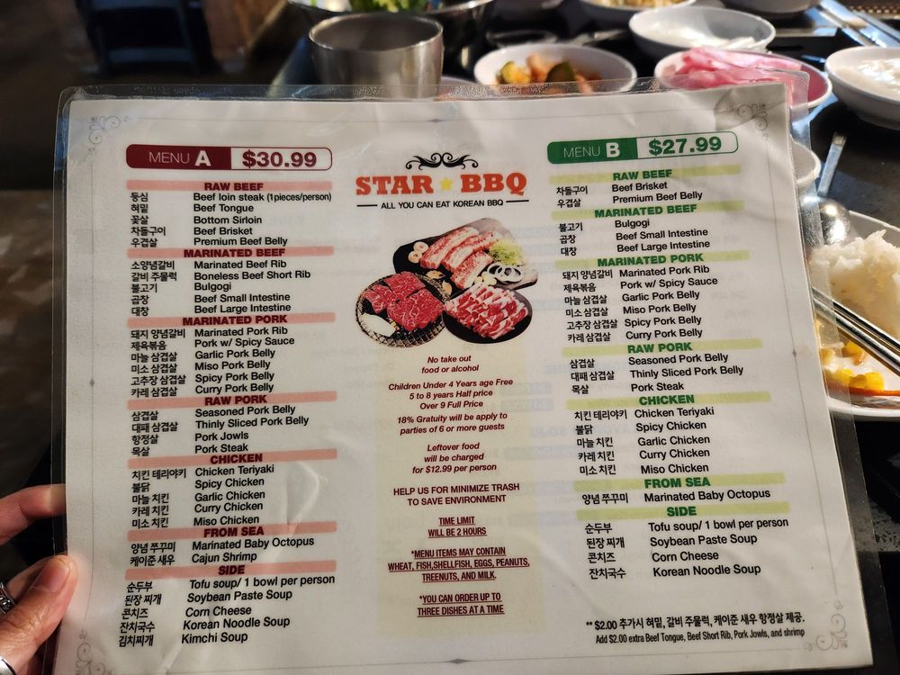 Star BBQ, located in Garden Grove, CA, is a popular Korean BBQ spot known for its lively atmosphere and excellent service. With a diverse menu offering AYCE Korean barbecue options, customers can indulge in high-quality meats and a variety of banchan sides. Wait times can be long, especially during peak hours, but the exceptional food and attentive staff make it worth the wait. The restaurant provides a unique dining experience with K-pop music playing in the background and cozy seating arrangements. Standout dishes include brisket, bulgogi, and flavorful sides like corn cheese and kimchi stew. Customers can also enjoy self-serve soft serve ice cream for dessert. For added value, paying in cash offers a 10% discount and a free soft drink. Overall, Star BBQ is a must-visit for those craving authentic Korean barbecue in a vibrant setting.